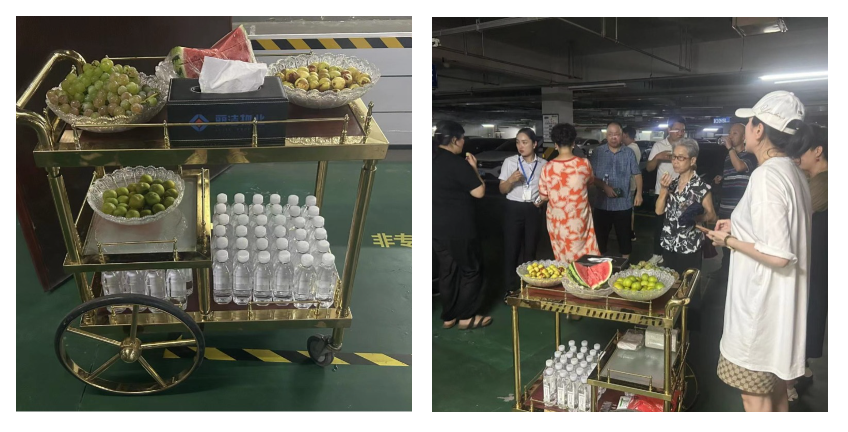 在潮濕悶熱的地下室開展工作是物業(yè)人的日常,但對前來參觀設(shè)備房的業(yè)主們的體能卻是個不小的挑戰(zhàn),為確保業(yè)主們能堅持全程,物業(yè)工作者貼心的準備了防暑藥品、礦泉水及消暑水果,在酷熱的地下室環(huán)境中,隨時隨地為業(yè)主們送上一份清涼。